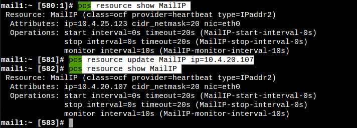 Floating IP address assignment | pcs resource create MailIP ocf:heartbeat:IPaddr2 ip=10.4.20.107 cidr_netmask=20 nic=eth0 op monitor interval=10s |