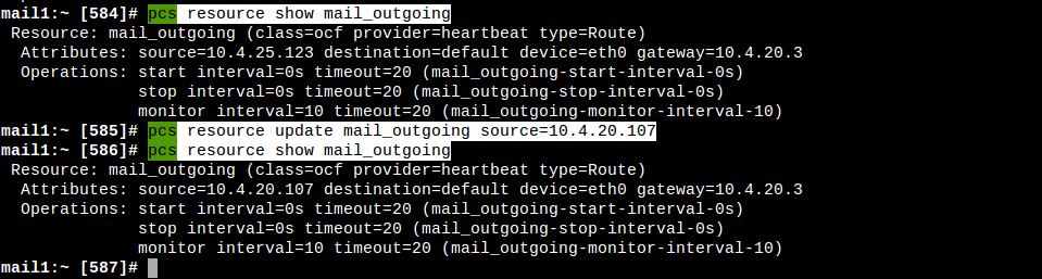 Updated outgoing SRC in routes | pcs resource create mail_outgoing ocf:heartbeat:IPsrcaddr ipaddress=10.4.20.107 op monitor interval=10 timeout=20 |