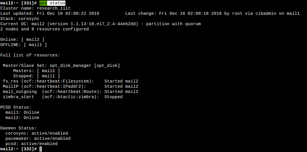 pcs cluster auth mail1 mail2on both servers. Keep username ashaclusterand password from above step.